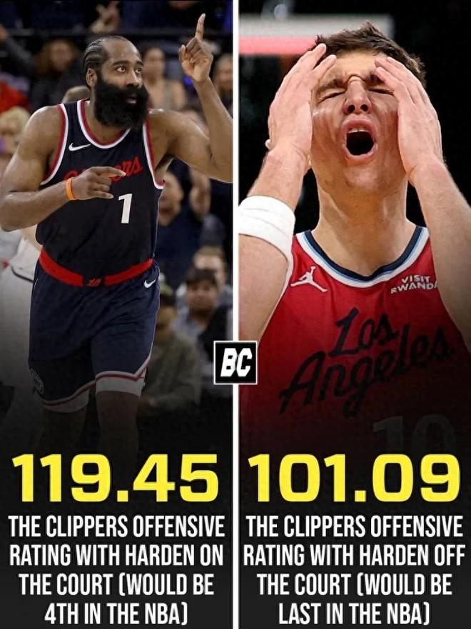 火箭时期,哈登曾单赛季场均36.1分,带队打出65胜;如今在快船,他场均34+9+9,却只能眼睁睁看着球队滑向深渊。这种反差,让人不禁感叹:如果哈登还在火箭,或许他早已再次捧起得分王奖杯,或许他早已带队重返西部强队行列。