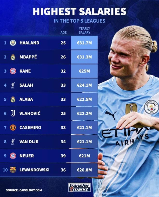 欧洲五大联赛工资榜排名发布!萨拉赫年薪近2亿 卡塞米罗1.73亿元