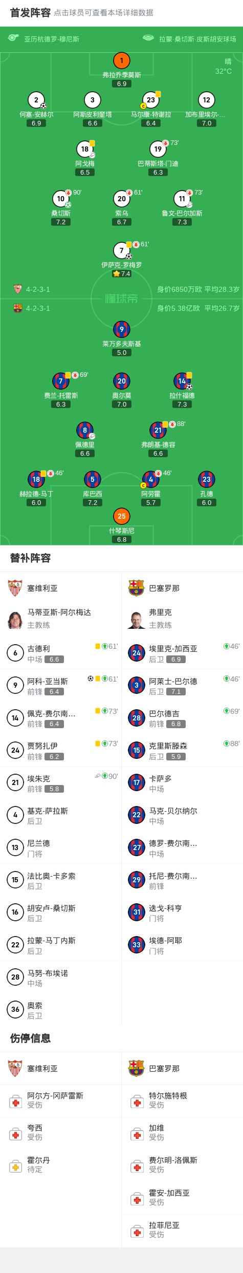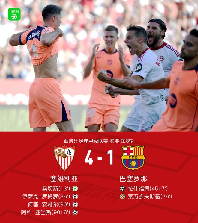 北京时间10月5日西班牙足球甲级联赛 联赛 第8轮,塞维利亚主场对阵巴塞罗那。上半场阿劳霍送点,桑切斯点射攻破旧主球门,之后伊萨克-罗梅罗禁区内推射破门扩大比分,补时阶段佩德里送助攻,拉什福德攻入个人西甲首球。下半场贾努扎伊禁区内放倒巴尔德被判罚点球,莱万主罚偏出球门,之后何塞-安赫尔禁区右侧低射破门,补时阶段阿科-亚当斯推射破门。最终巴萨1-4塞维利亚遭遇联赛首败。
